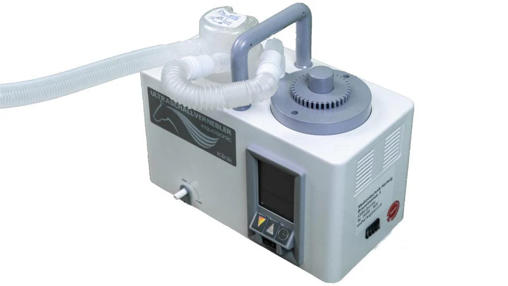 Unsere Ultraschallvernebler der Baureihe equosonic erreichen Tropfengrößen von 0,5 bis 5 µm, bei einer Leistung von bis zu 5,5 ml/min. Für normal große Pferde sind 4 ml/Min völlig ausreichend. Sie erreichen sowohl die oberen als auch unteren Atemwege. Dies unterscheidet Ultraschallvernebler von den technisch einfacheren Kompressorverneblern, da der funktionale Hauptanteil der Atemwege mit seiner sehr großen Oberfläche (Bronchialsystem, Alveolarsystem der Lunge) voll erreicht wird.
